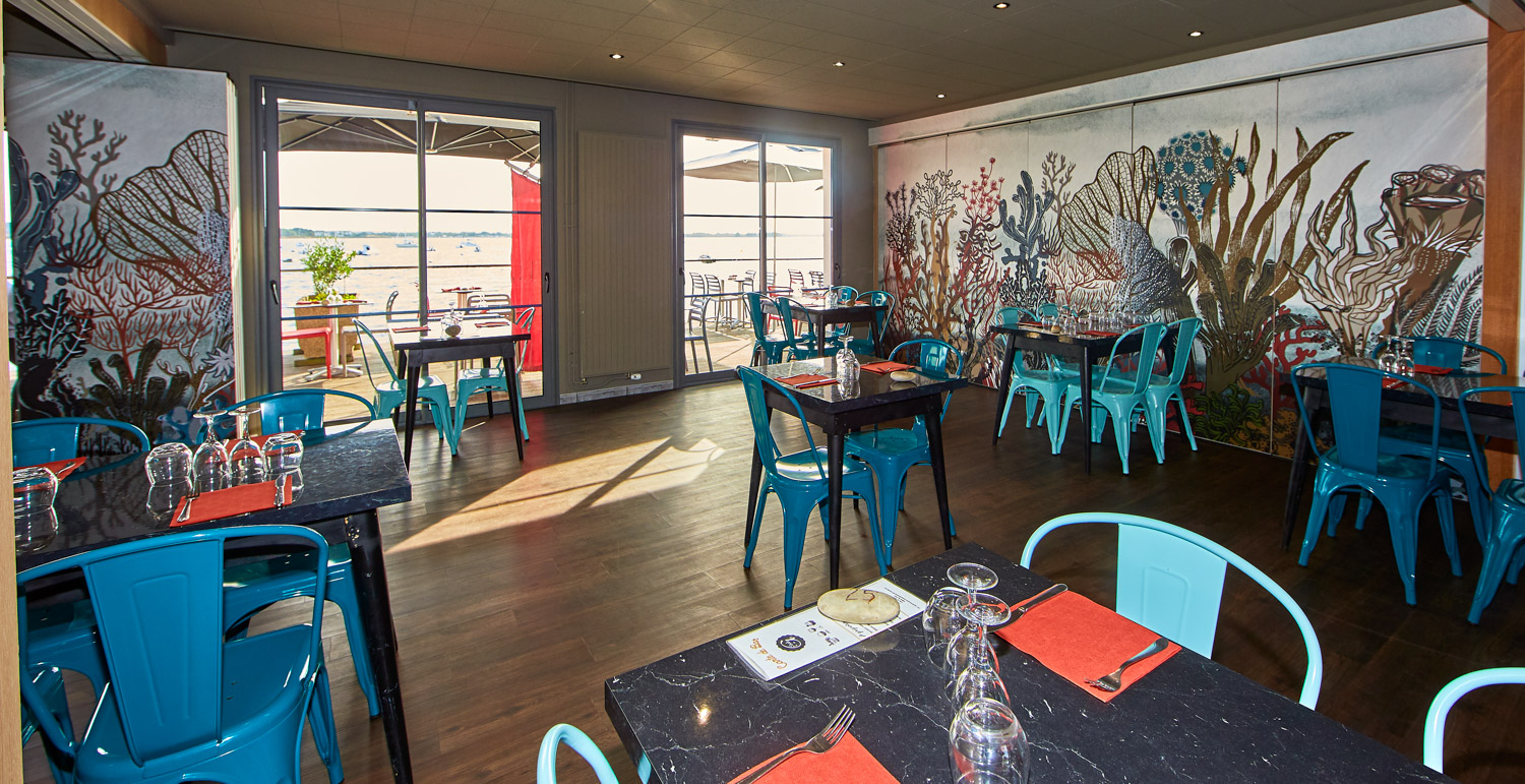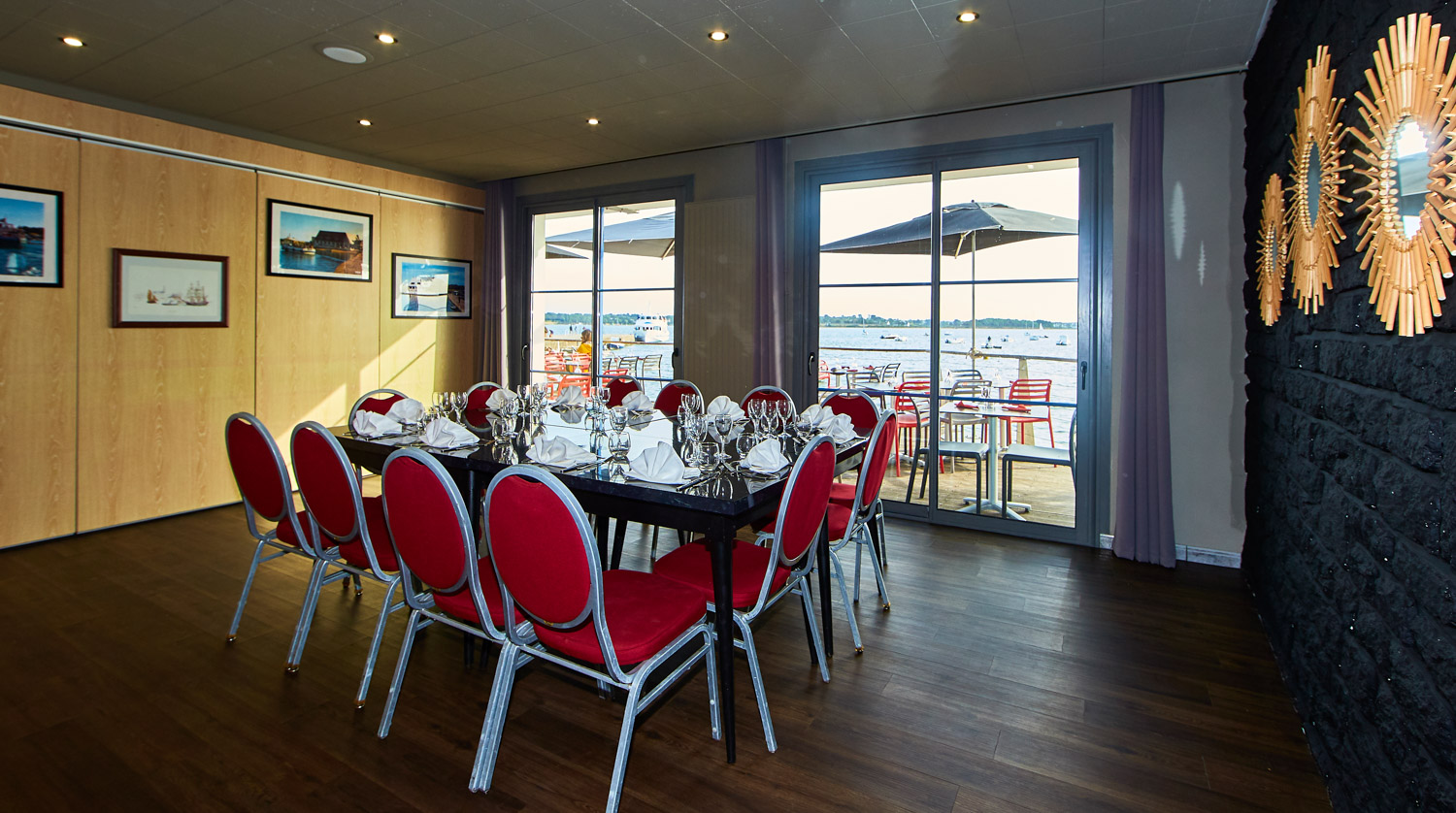 L’Escale en Arz vous propose une salle de restaurant modulable d’une capacité de 150 couverts, ainsi qu’une grande terrasse les pieds dans l’eau.